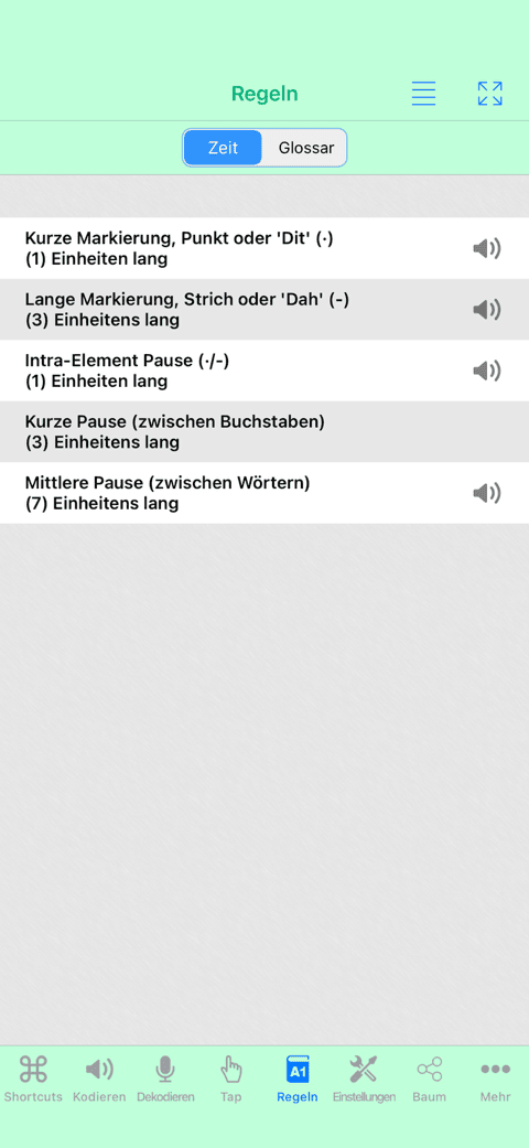 Das vollständige Morsealphabet (einschließlich der Prosigns) kann ebenfalls angezeigt und der zugehörige Morsecode abgespielt werden.