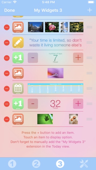 - General : Up to 3 extensions can be added to the Today view. In consequence, 3 tabs are displayed in the app. As before, every tab (and extension) can contain as many widgets as needed.