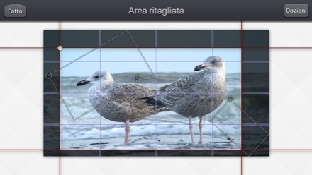 L'area ritagliata può essere definita con alcuni semplici gesti, ma nel caso sia necessaria una certa precisione, è possibile modificare direttamente i valori (in pixel per la dimensione e la posizione, in gradi per l'angolo).